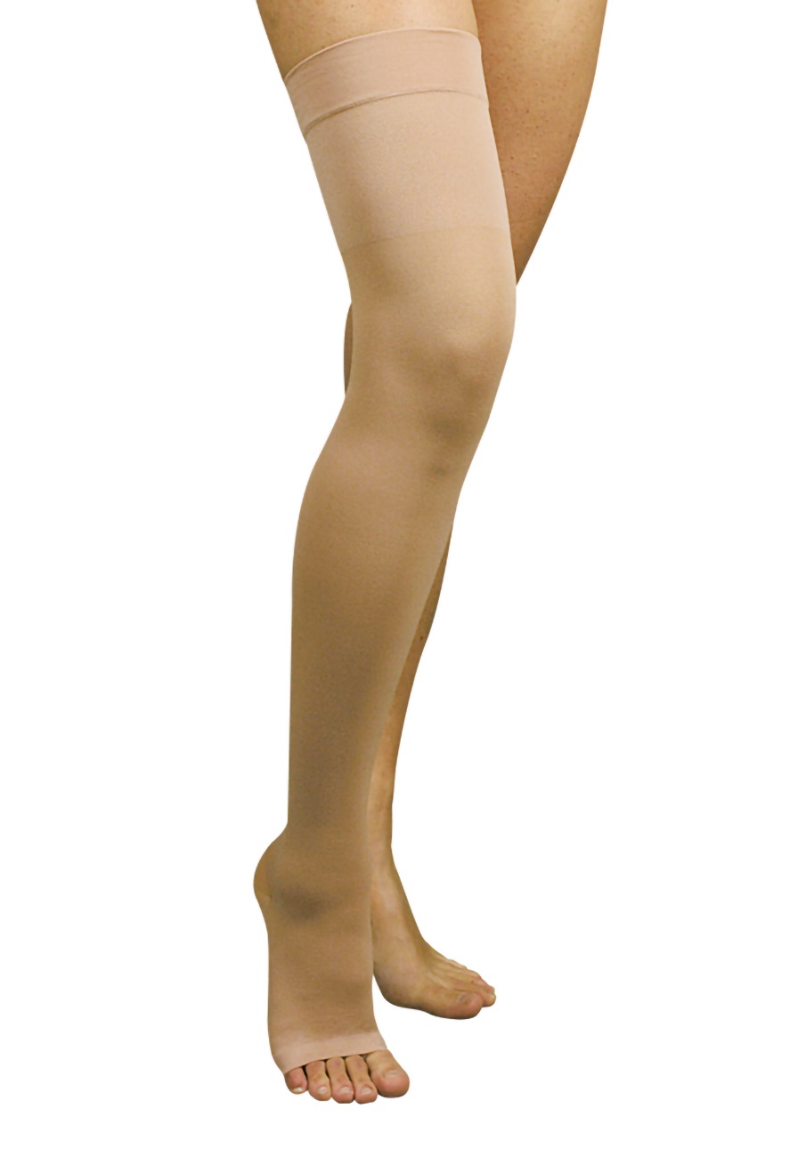 Calza alla coscia autoreggente morbida e duratura nel tempo, senza cuciture, p/aperta (AGH), con classe di compressione kl.1, 18-23 mmHg.: esercita una compressione graduata leggera ed è autoreggente grazie all’applicazione di un’apposita banda in silicone.