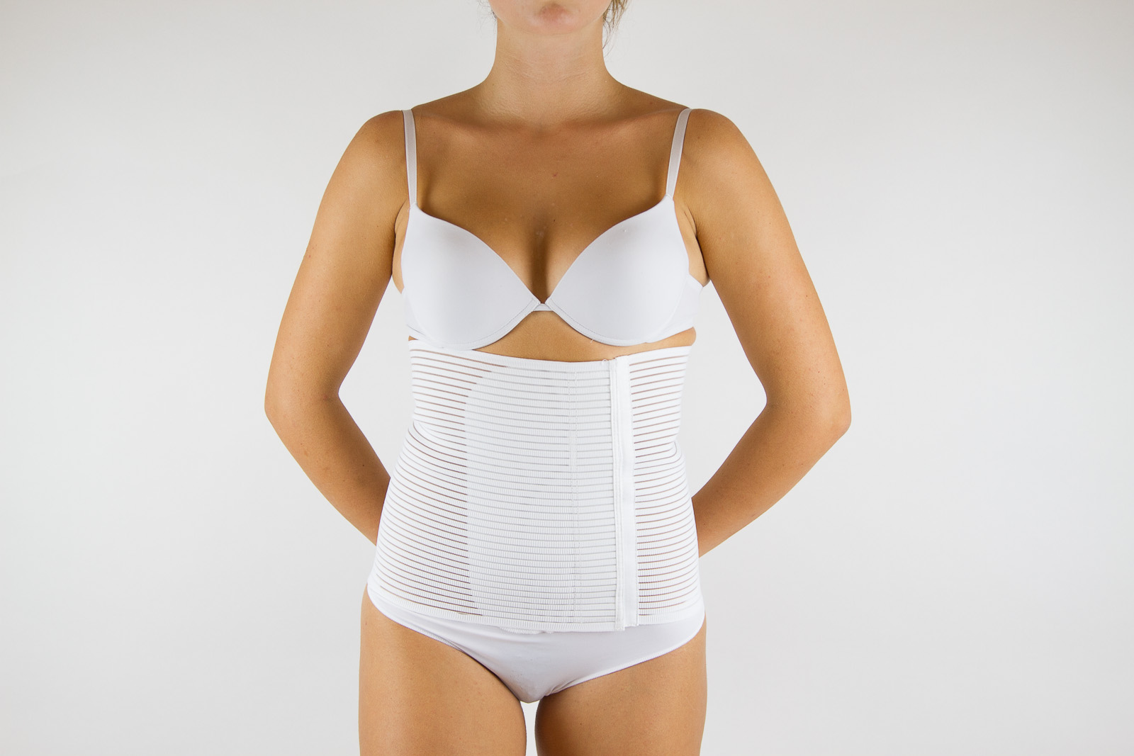 Fascia post-operatoria Aerflex con chiusura anteriore a velcro, altezza 20 cm. Il tessuto areato garantisce un’elevata traspirazione, mentre il cotone che ricopre la banda assicura un contatto igienico e assorbente con eventuali ferite.