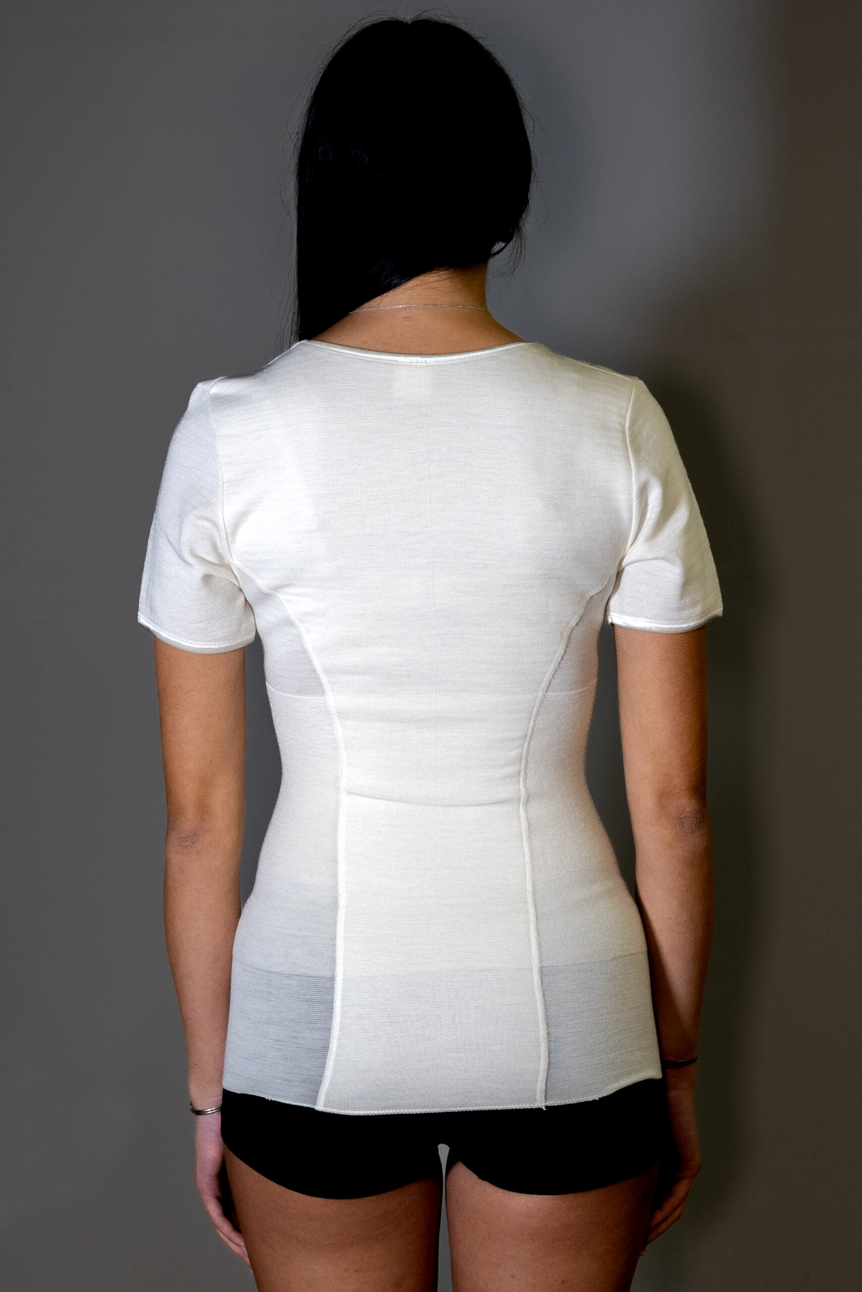 Maglia da donna a mezza manica, con cintura tubolare incorporata schiena doppia che apporta un forte sostegno con effetto benefico sui reni e sullo stomaco. La maglia si arricchisce di un motivo ornamentale con scollo a V macramé e di orlatura del giromanica in pregiato pizzo elastico.