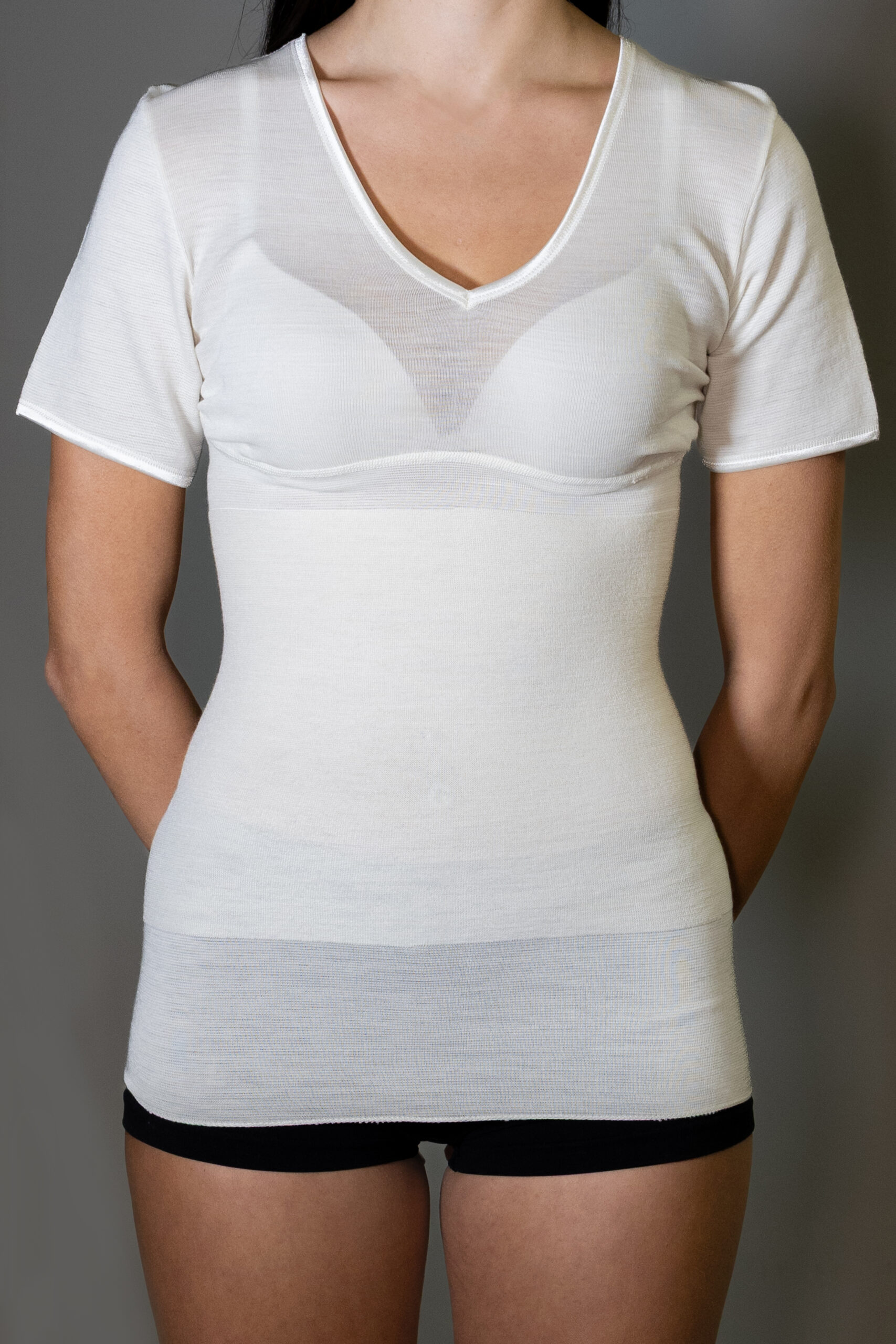 Maglia femminile a mezza manica, con cintura tubolare incorporata in funzione di sostegno benefico, in particolare a reni e stomaco: un prodotto di grande eleganza, grazie all’orlatura morbida ed elasticizzata del giromanica e al motivo ornamentale in raso con scollo a V.